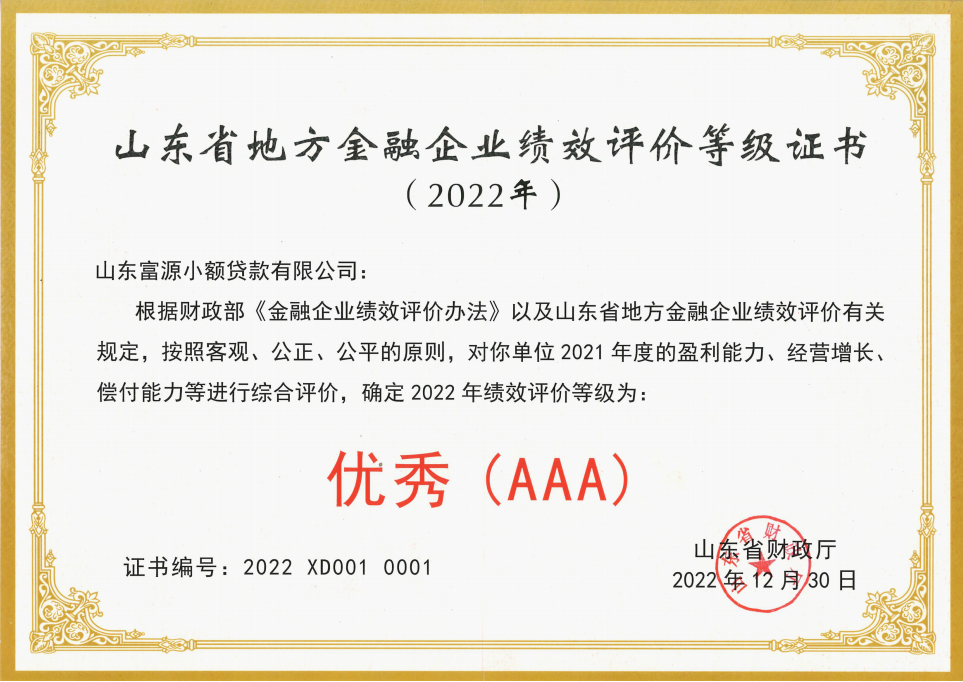 近日,富源小貸榮獲省財政廳頒發的2022年山東省地方金融企業績效評價“優秀(AAA)”等級證書,這是公司連續4年獲此殊榮。