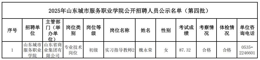 根據中共山東省委組織部、山東省人力資源和社會保障廳關于印發《2025年省屬事業單位公開招聘工作實施方案的通知》(魯人社發〔2024〕15號)要求等相關規定,山東城市服務職業學院經過公開招聘報名、考試、考察、體檢等工作,現對擬聘用人員(第四批)進行公示,公示期為5個工作日,自2025年8月5日至2025年8月11日(不含節假日)。公示期間,如對公示人選有異議,請及時向山東省商業集團有限公司反映。